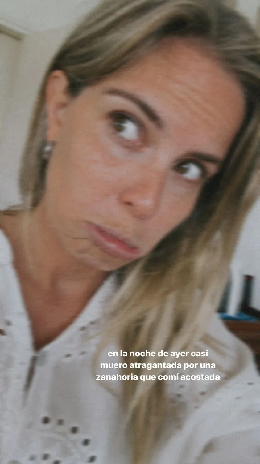 "En la noche de ayer casi muero atragantada por una zanahoria que comí acostada", escribió en sus historias la conductora y cantante, que mostró que el alimento en cuestión era un bastón de esa verdura.