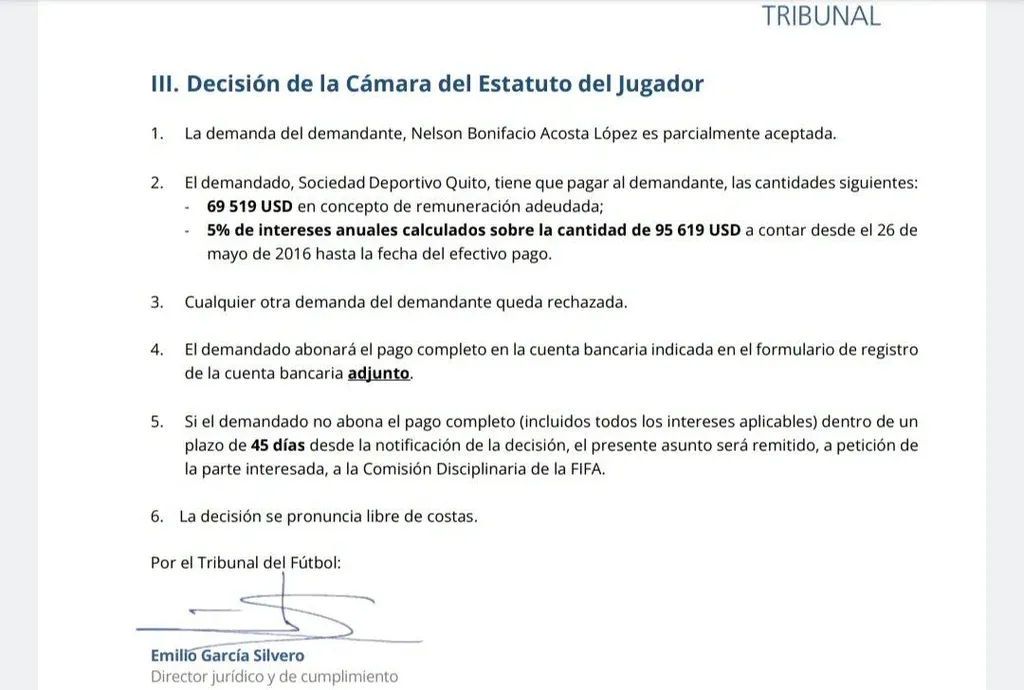 El club debe abonarle, en un plazo de 45 días, US$ 69.519 más el 5% anual de intereses calculados sobre US$ 95.619 desde el 26 de mayo de 2016.