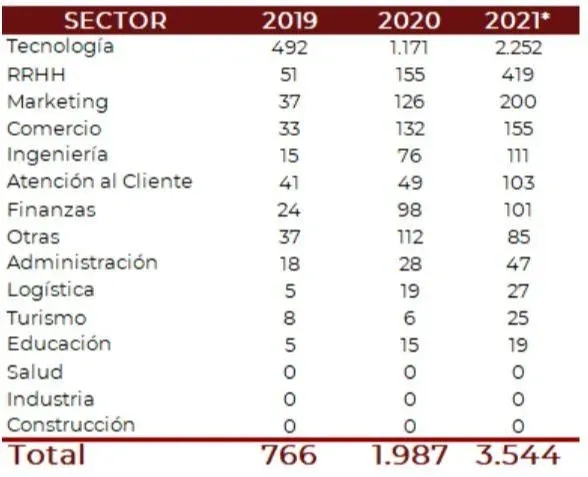 En segundo lugar se encuentra Recursos Humanos que entre 2019 y lo que va de 2021 aumentó más de siete veces. En este año tres de cinco llamados para el área manejaron la opción de trabajo remoto.