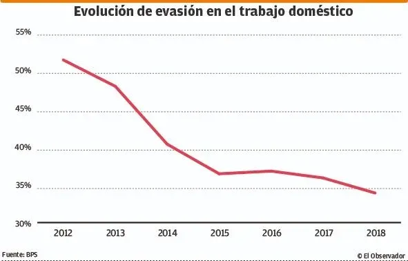 Desde 2006 hasta 2018 se produjo un aumento anual ininterrumpido en la cantidad de trabajadoras domésticas registradas en el BPS hasta llegar el año pasado a 76.657 cotizantes. El crecimiento de las empleadas entre el primer y el último año fue de 75,6%. A su vez, como consecuencia de ese incremento se verificó una caída de la evasión. En 2012 la evasión en el servicio doméstico fue de 51,7%; el año pasado se ubicó en 34,4%.