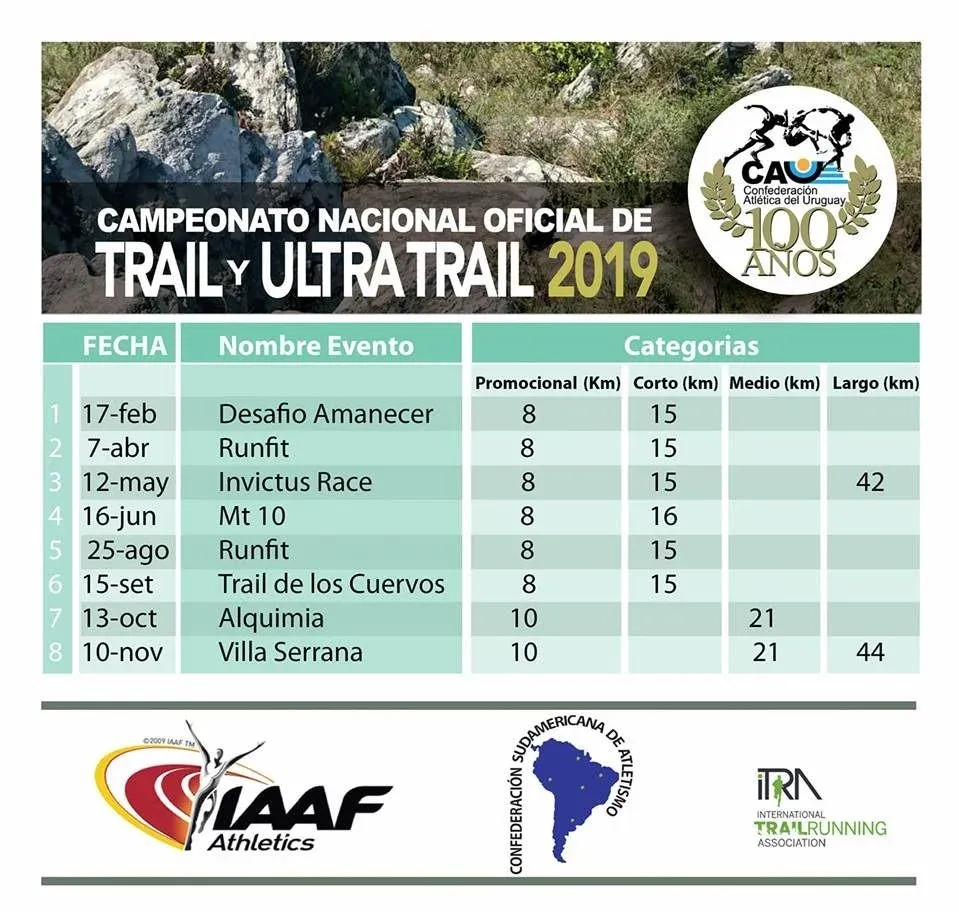 La Confederación Atlética del Uruguay (CAU) dio a conocer su campeonato oficial de trail 2019, el cual contará con ocho etapas, lo que confirma el crecimiento de esta disciplina tiene entre los corredores locales, al contar con un mayor número de pruebas que el año pasado.