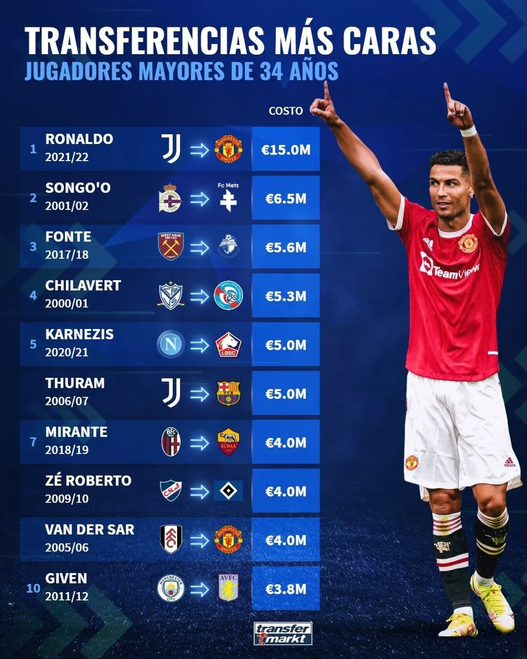 El pase de Cristiano Ronaldo a Manchester United por 15 millones de euros encabeza el ranking de los jugadores mayores de 34 años por los que más se han pagado, según el portal internacional especializado en transferencias Transfermarkt.com.