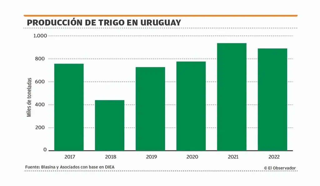 Con esa superficie y un rendimiento de 3.800 a 3.900 kilos/ha la producción quedaría cerca de 900 mil toneladas, lo que dejaría una proporción similar de grano para el mercado interno y la exportación.