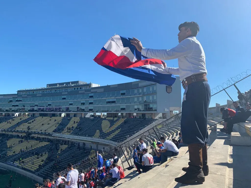 Más allá de eso, todo transcurre con normalidad. Gaspar Valverde alienta a la hinchada carbonera; les respondemos que precisan un parlante para alentar. Nacho Obes canta temas de Queen; les gritamos que son un cuadro inglés. Nos animan a que los llevemos al Parque Central para que lo puedan quemar; les respondemos que a ver si ustedes van. El “Gaucho Bolso”, conocido personaje de la tribuna del Parque Central, despliega al viento su bandera de Artigas –esa que siempre luce en la Abdón Porte– y dice que le pone contento que por fin Peñarol tenga su estadio, aunque sea “cemento y nada más”.