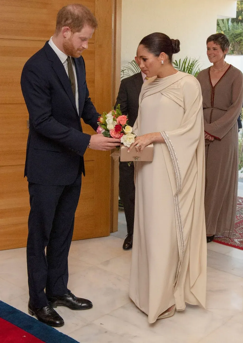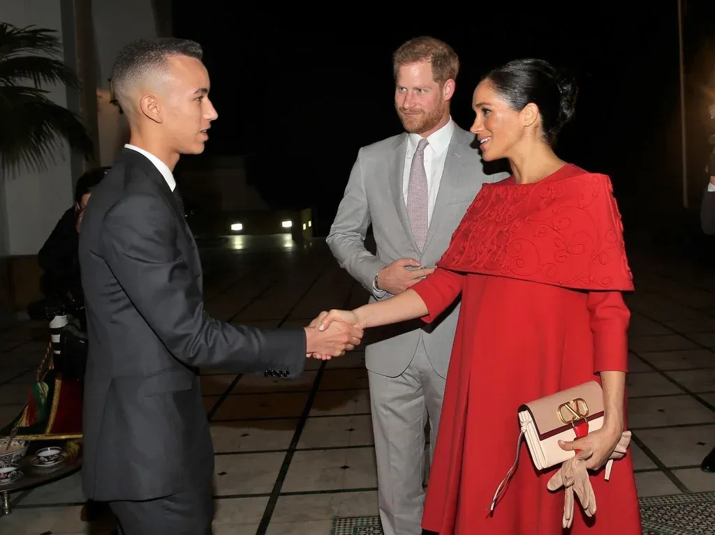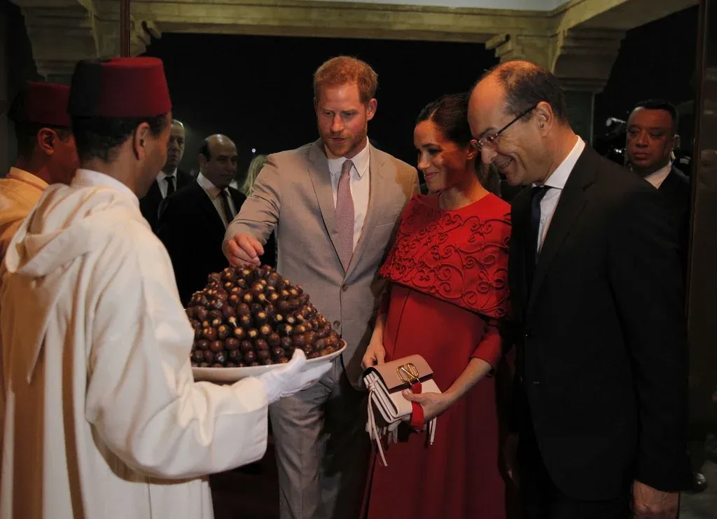 A su llegada, el príncipe Enrique, en traje gris claro, y la duquesa de Sussex –con un vestido rojo firmado por Valentino acompañado por una cartera de la misma casa– fueron recibidos con una tradicional bandeja de dátiles, una muestra de hospitalidad en Marruecos.