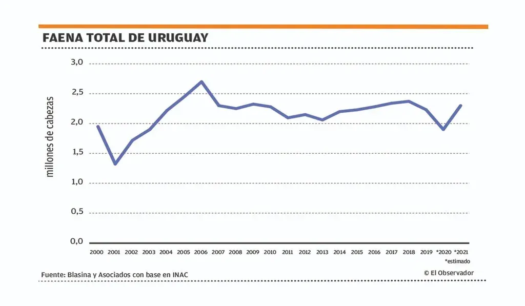 El USDA prevé para 2021 una faena en Uruguay de 2,2 millones de cabezas frente a 2 millones de 2020, cuando la industria maneja un incremento que llevaría la faena a 2,3 millones en 2021.