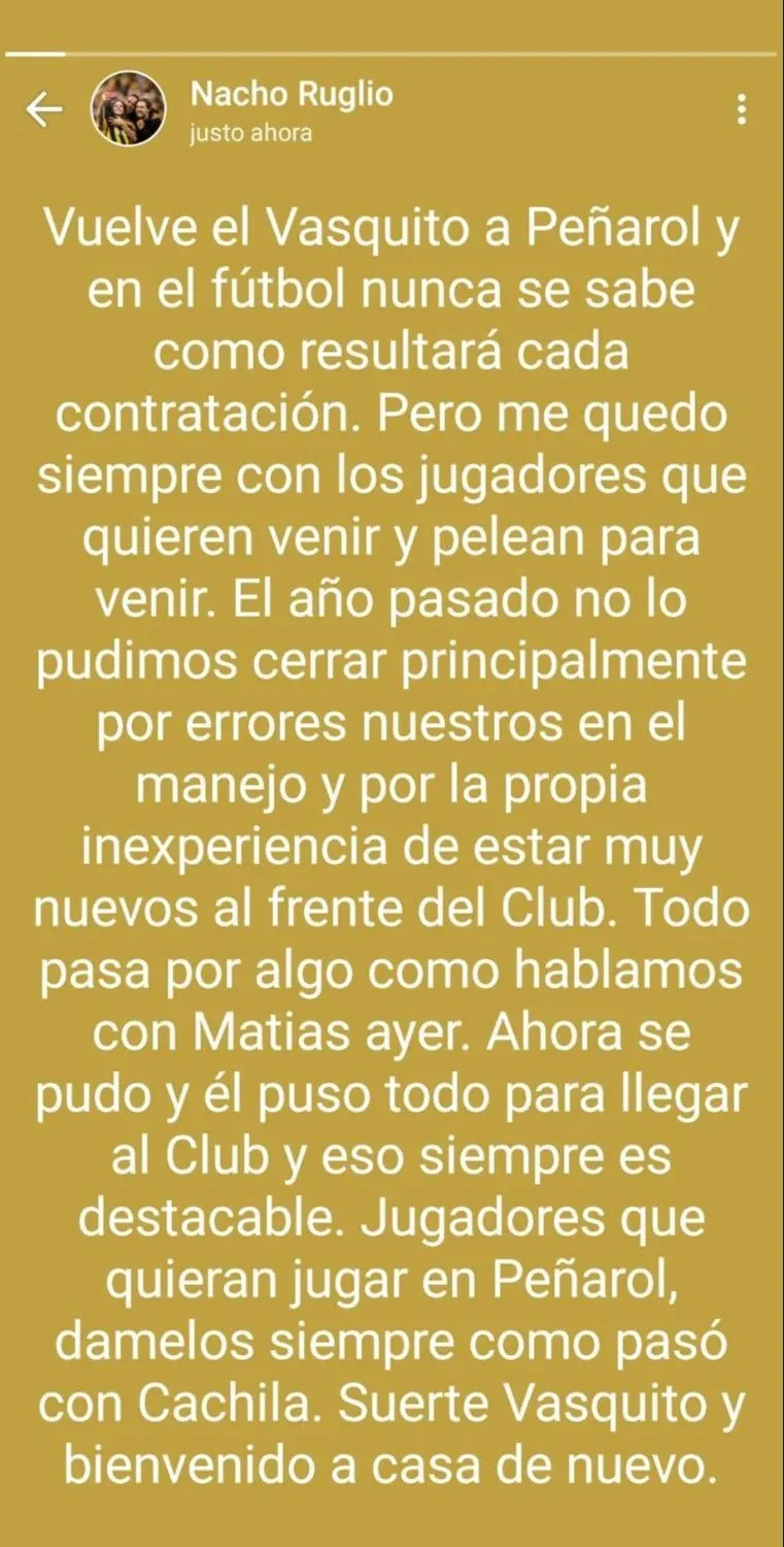 “Jugadores que quieran jugar en Peñarol, dámelos siempre como pasó con Cachila (Ramón Arias, quien llegó en este período de pases). Suerte Vasquito y bienvenido a casa de nuevo”, concluyó Ruglio.