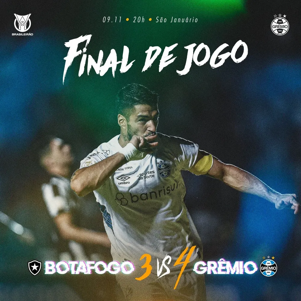 Luis Suárez tuvo una actuación descomunal con Gremio este jueves al anotarle tres goles al líder del torneo Botafogo, para poner a su equipo igualado en el primer puesto del Brasileirao a falta de cinco fechas para el final.