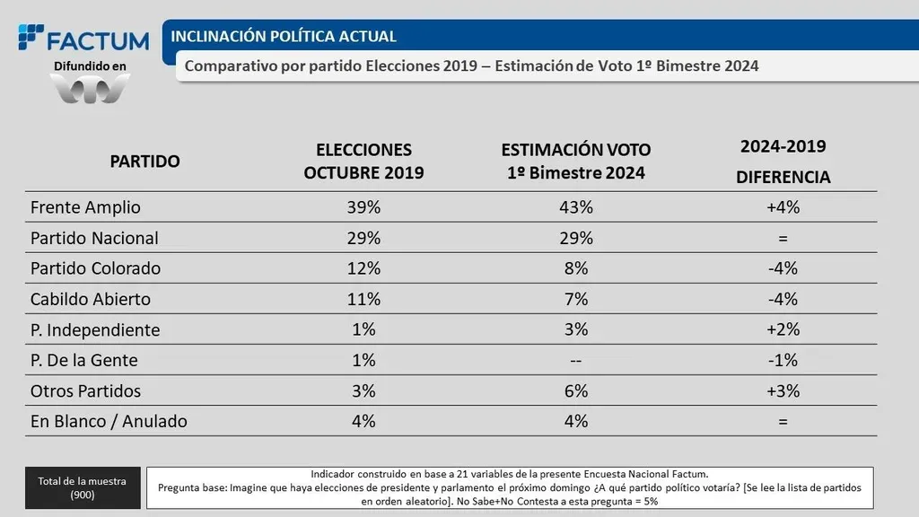 "Se aprecia un escenario donde el FA aparece mejor posicionado para octubre 2024 respecto a octubre 2019", indicó Factum. "La suma de los partidos que conforman la Coalición Republicana experimenta una pérdida neta de 7 puntos con respecto a lo obtenido en 2019. Esas pérdidas son canalizadas hacia el FA y hacia los 'Otros partidos'", explica el informe.