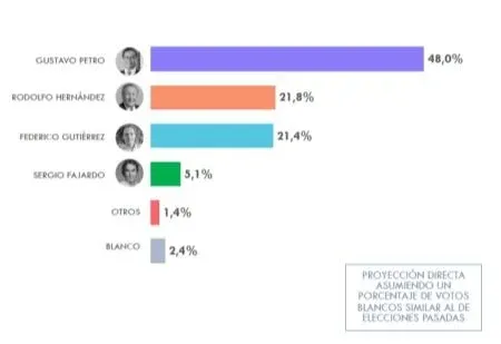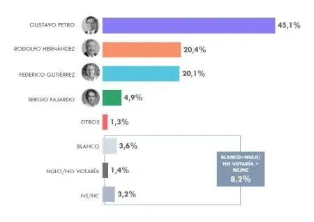 Hasta el momento, y en esto coinciden todas las encuestas, aunque está muy cerca de conseguirlo, Petro todavía no alcanza el umbral necesario para imponerse en la primera vuelta. Sin embargo, el clima de campaña y la percepción de electorado lo dan como ganador en cualquier escenario. Según el relevamiento de la Celag, realizado antes de que Ingrid Betancourt bajara su candidatura, el 53,2 por ciento de los encuestados creía que Petro será el nuevo presidente de Colombia, mientras que el 22,7 dijo que lo será Gutiérrez y el 13,3 se inclinó por Hernández.