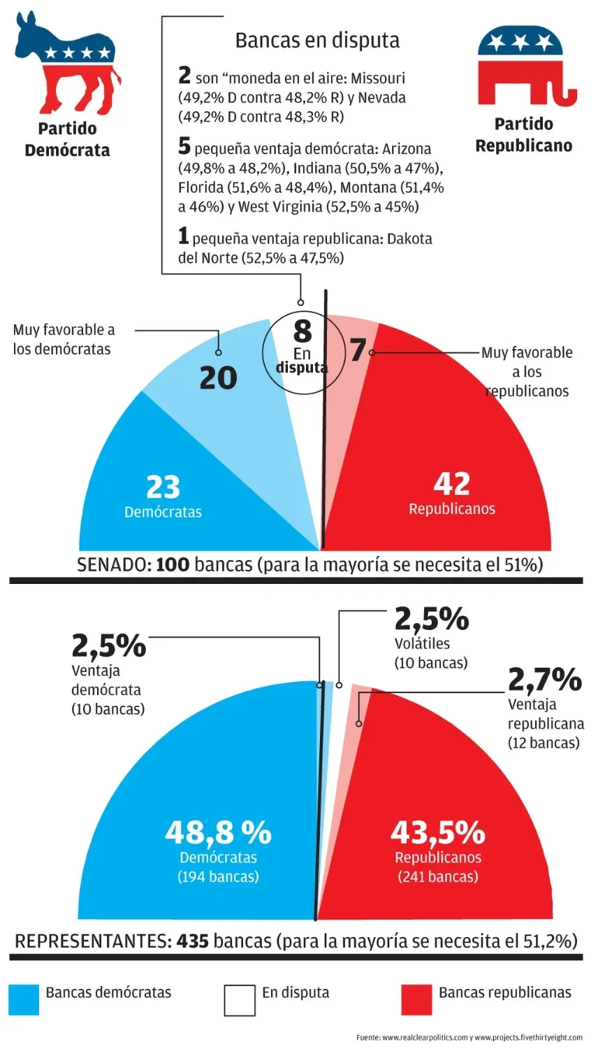 Si todo sucede tal como las encuestas están previendo, Estados Unidos tendría, a partir del 3 de enero de 2019, un Congreso dividido entre ambas facciones. Pero esa división es suficiente para trabar las intenciones legislativas de Trump en los dos años que le quedan de gobierno antes de una nueva elección presidencial en noviembre de 2020.