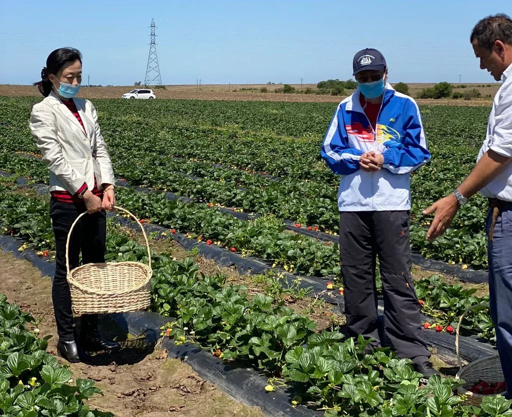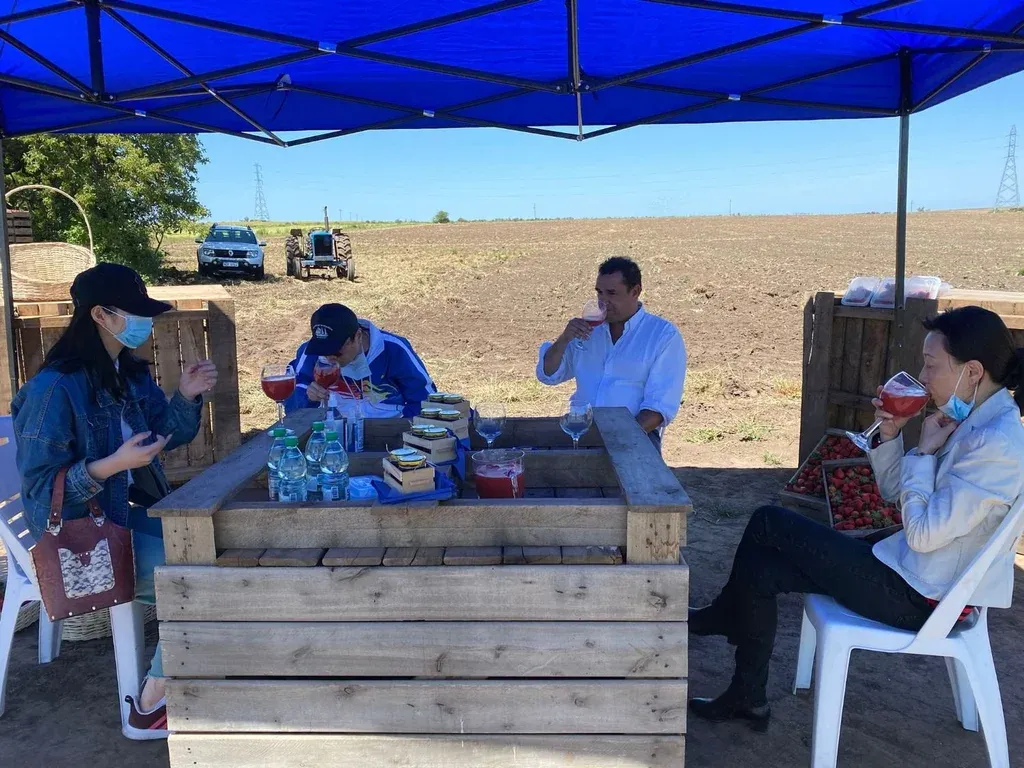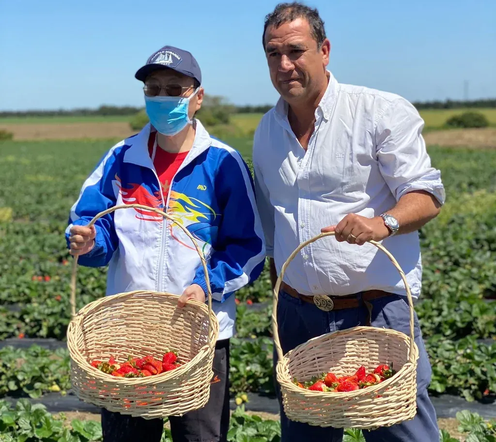 Da Silva y el embajador chino cosecharon frutillas y realizaron una degustación de la fruta y jugo.