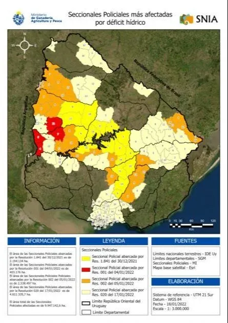 En los 16 departamentos la emergencia se decretó por secciones. Varios departamentos están amparados en su totalidad. Los únicos departamentos que no están bajo declaración de emergencia agropecuaria son Rocha, Maldonado y Colonia.