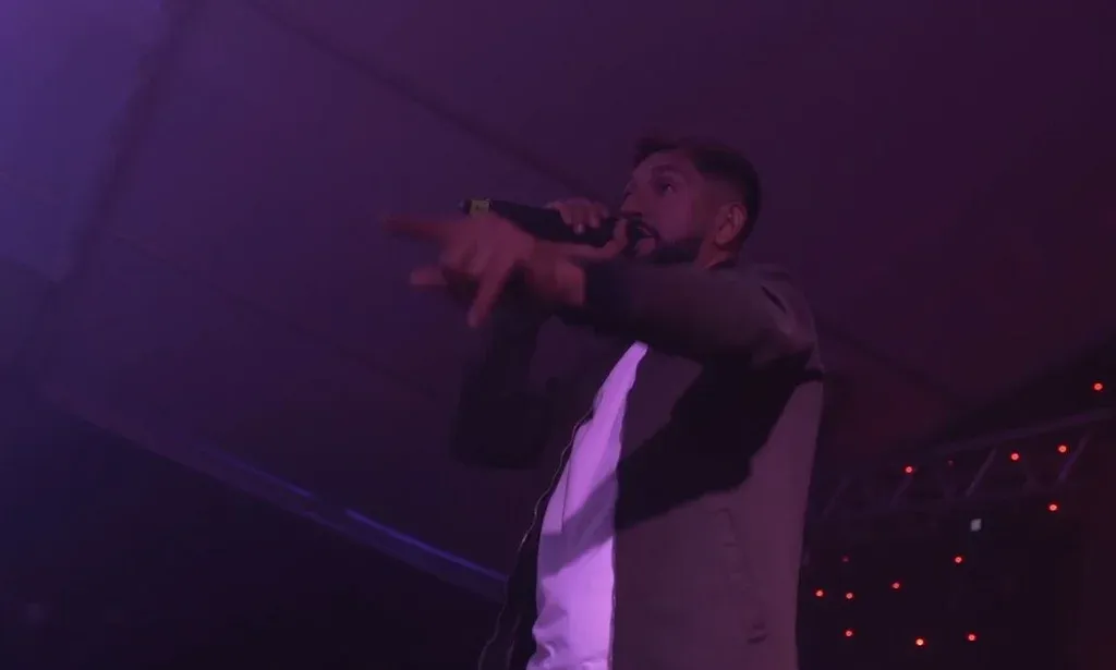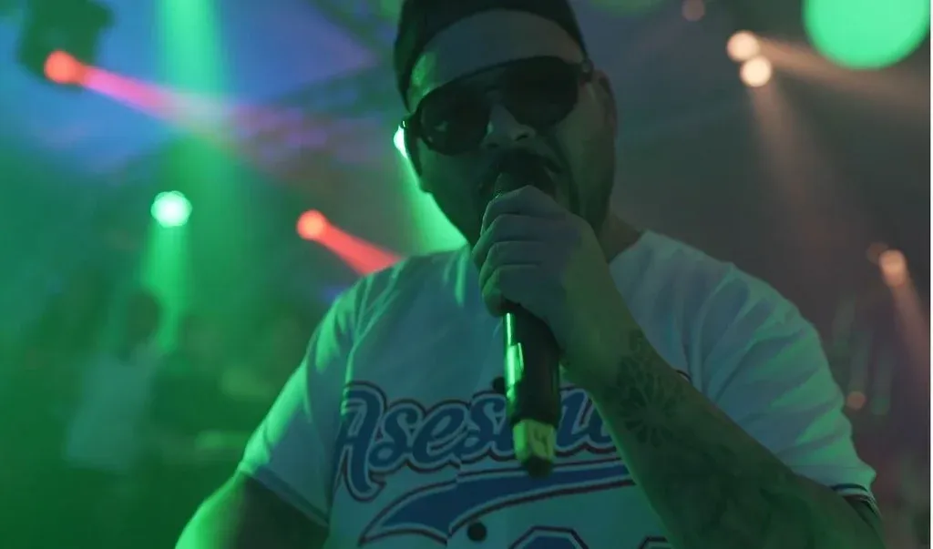 Unos segundos después, llega el turno de El Gucci. Está de gorro y lentes de sol. En determinado momento le da el micrófono a uno de los hijos de Marset para que cante.
