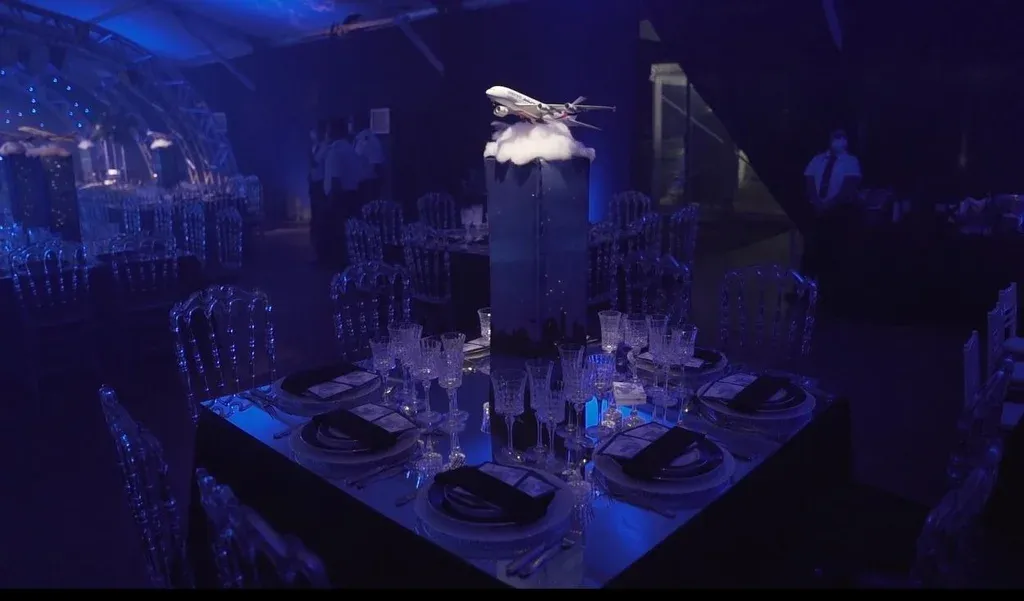 Siguiendo con la temática del festejo, los mozos recibían a los invitados y servían sus mesas vestidos como pilotos y azafatas. Pequeños aviones de juguete, con la inscripción “Emirates Marset”, decoraban las mesas. Decenas de valijas, tipo carry on, desplegadas en el salón, la entrada simulaba ser una pista de aeropuerto.
