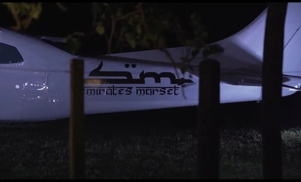 Esa noche la estancia 23 de abril estaba iluminada por fuera con luces azules, una avioneta estaba estacionada en la entrada. En el costado, la inscripción: "Emirates Marset".