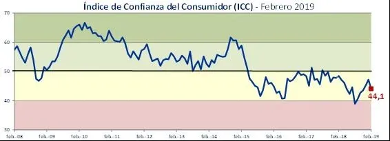 Al considerar la evolución de los primeros dos meses de 2019 en comparación con igual período de 208 el subíndice que registró la mayor caída fue el de Predisposición a la compra de bienes durables con una baja de 11,5 puntos en febrero y 7,8 comparando el bimestre.