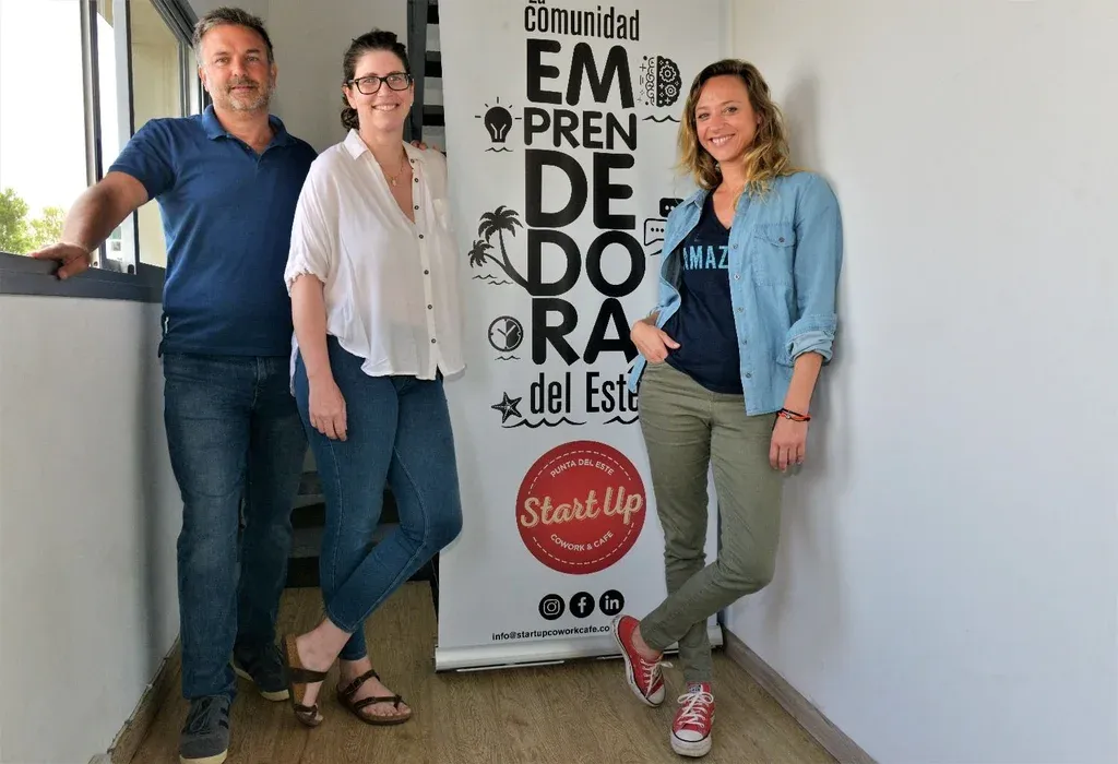 En la planta baja de Startup Cowork Café, la cafetería y el jardín brindan espacios con vista al mar. En el primer piso el cowork recibe con mesas para compartir, sillas de colores, frases inspiradoras y un banner que nombra a “La comunidad emprendedora del Este”. El tercer piso es para reuniones. El ambiente es cálido entre murmullos, risas, el viento fresco y los ruidos de la cocina.