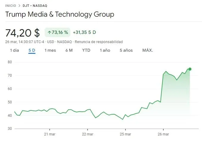 Las acciones de DJT, propiedad de Trump Media and Technology Group (TMTG), la corporación paraguas de la red social Truth Social, subían más de 70% hasta US$ 74.