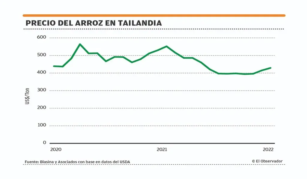La exportación deberá colocar un saldo mayor, pero en un momento en que el precio del arroz, tras languidecer en el segundo semestre de 2021, ha despertado. Esta semana el arroz tailandés –que es referencia para el grano largo, como el uruguayo– aumentó de US$ 415 a US$ 428 por tonelada, el nivel más alto desde junio. El precio del arroz partido al 5% de Vietnam marcó también la semana pasada los máximos del año, entre US$ 410 y US$ 415 por tonelada el 10 de marzo, en comparación con los US$ 400 por tonelada de la semana anterior.