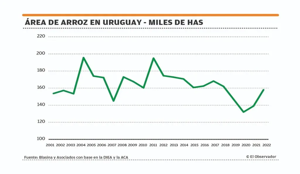 Las perspectivas hacia adelante son importantes: se llegó a 164 mil ha en 2021/22 y tras dos años buenos podría seguir subiendo el área. Se podría llegar a 180 mil con cierta facilidad. El tema es que el aumento de costos productivos inevitables empieza a incidir. El fertilizante en el arroz es un insumo que no se puede evitar.