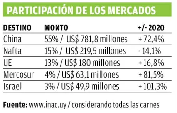 Con base en el peso canal, siempre para carne de bovinos, China sigue siendo el mayor cliente, captando 169.357 toneladas (el 59% del total), elevando su demanda un 52,3% en lo que va de 2021 con relación al mismo lapso de 2020.