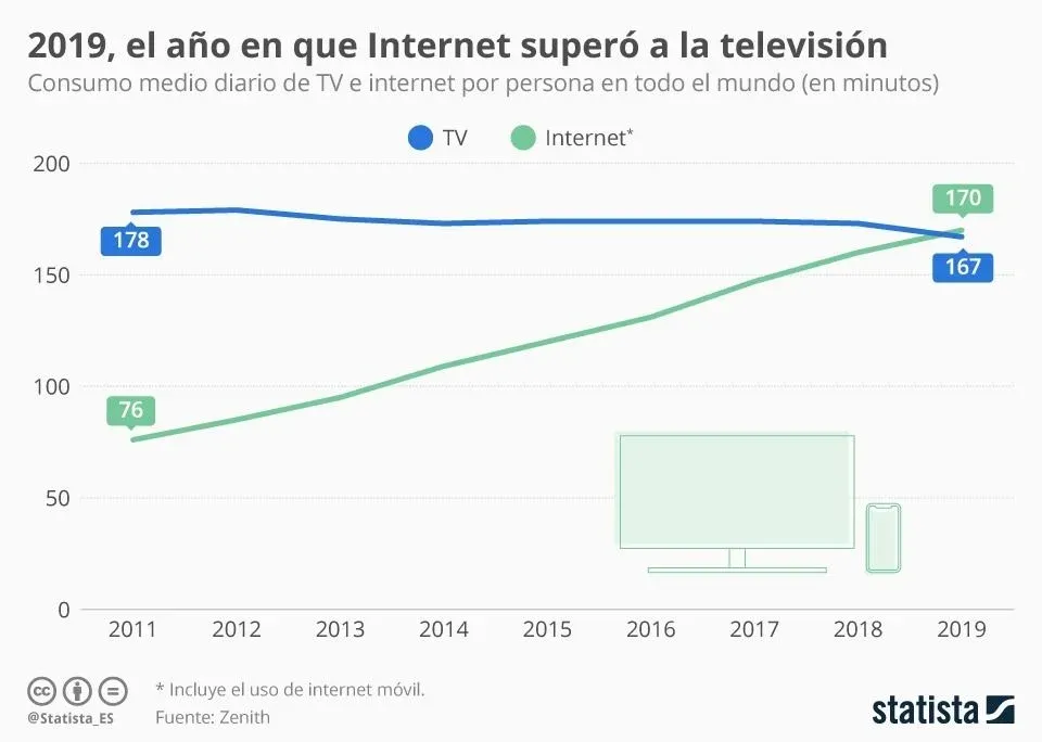 Tal y como muestra esta infografía de Statista, en lo que va del año el consumo promedio online se situó en los 170 minutos diarios por persona (es decir, dos horas y 50 minutos), contra 167 minutos en promedio para la TV. Detrás de la popularidad de los medios digitales está en gran medida el creciente uso de internet en los teléfonos móviles, cuyo consumo alcanzó los 130 minutos por día.