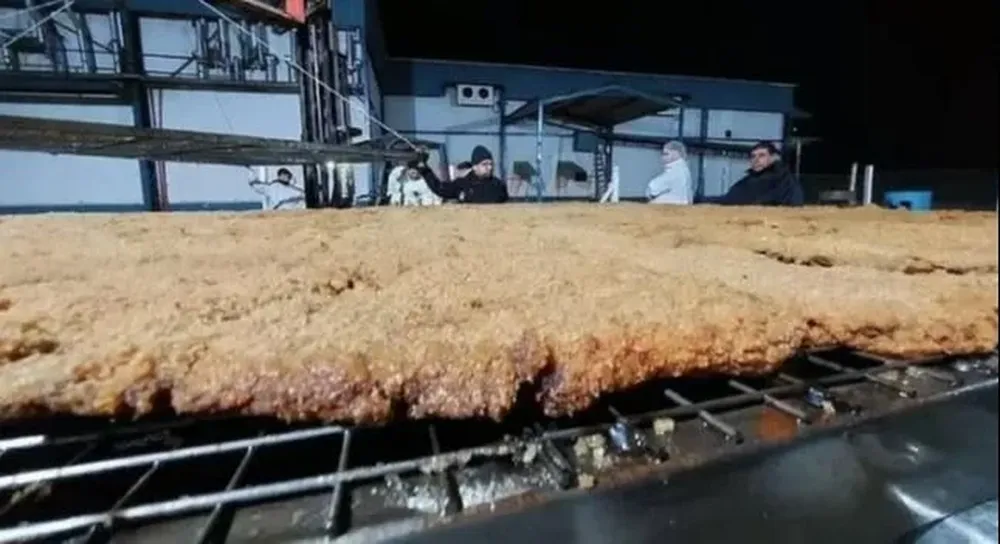 La milanesa más grande del mundo se puso a freír en 2.000 litros de aceite a una temperatura de 140 grados. Para eso, se usó una mega sartén especialmente diseñada (de 4,5 metros de largo por 3,2 metros de ancho y con 50 centímetros de altura).