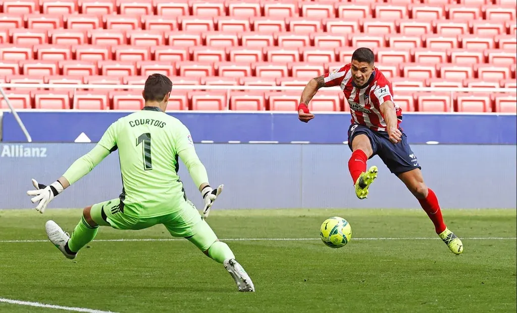 AFP Luis Suárez definiendo tres dedos con Atlético de Madrid ante Real Madrid El gol fue prácticamente igual y por eso lo comparan en el fútbol brasileño.