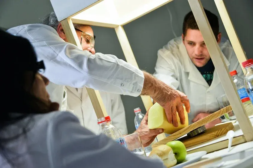 El queso se sirve en el centro de la mesa y de inmediato cinco pares de ojos se posan en él. Los jueces, vestidos con túnicas blancas, lo giran, lo inclinan, lo agarran con sus manos e inspeccionan todos sus agujeros y pliegues. Con el pulgar y el índice –y sin perder la delicadeza ni la solemnidad del momento–toman un trozo y lo pasean frente a sus narices. Cierran los ojos y por unos segundos el tiempo se detiene. Lo visual desaparece y el cuerpo se concentra en el olor de esa porción de lácteo.