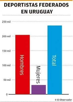 Los datos del informe de 55 entidades deportivas dirigentes (EDD), informaron al órgano estatal que de un total de 236.540 deportistas federados que hay en Uruguay, 204.317 son hombres y 32.123 son mujeres, eso da precisamente ese 13,6% aludido.
