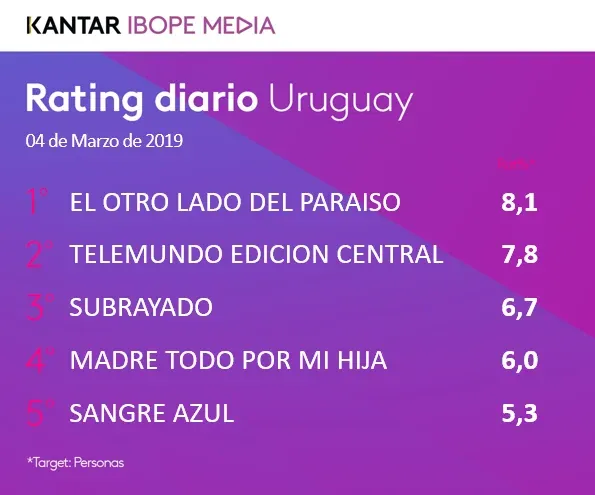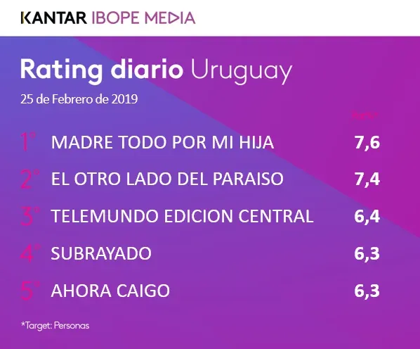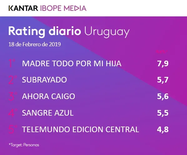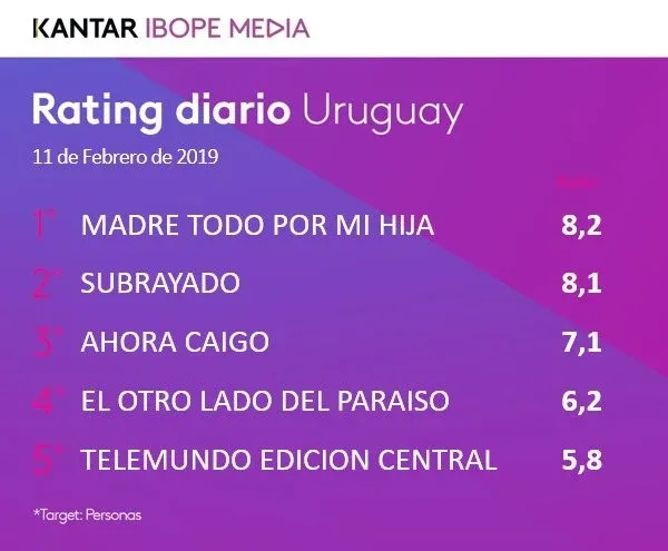 La novela empezó en verano y arrancó con mediciones tibias. Pero una vez que acabó la temporada (que implica partidos de fútbol nocturnos los lunes, como la Supercopa uruguaya) más una trama de ficción con una buena dosis de venganza el programa, que en febrero apenas figuraba en el top cinco de Ibope, no bajó de los dos primeros en las últimas tres semanas, con distancias mínimas en comparación al primero.