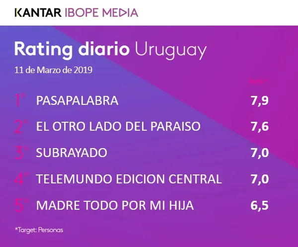 La artillería de Saeta fue Pasapalabra, conducido por Jorge Piñeyrúa y que estrenó este lunes 11 la versión criolla del formato internacional. Su primer programa midió 7,9 puntos de rating (94.800 personas, aproximadamente), según la consultora Kantar Ibope Media, con lo que fue el programa más visto en Montevideo, según las mediciones, aunque seguido muy de cerca por la serie brasileña El otro lado del paraíso, que emite La Tele, que midió 7,6 puntos (91.200 personas).
