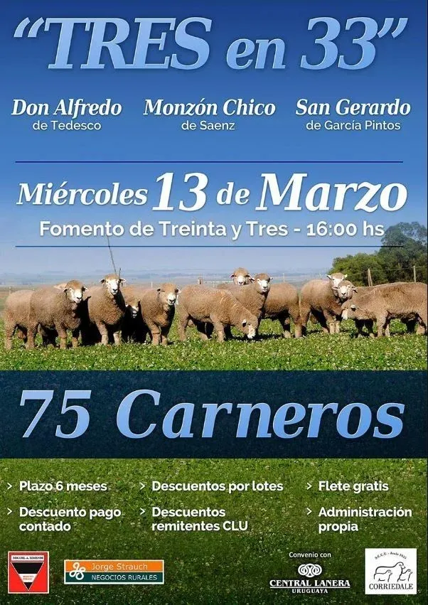 - Y el miércoles 13 de marzo, en la Sociedad Fomento de Treina y Tres, en lo que será la venta conjunta de San Gerardo; Don Alfredo, de Tedesco; y Monzón Chico, de Saenz.