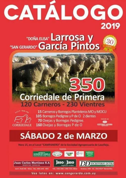 - El sábado 2 de marzo, en el local Campanero de Minas, en lo que será el 30° remate anual de San Gerardo, de García Pintos; y Doña Elisa, de Larrosa.