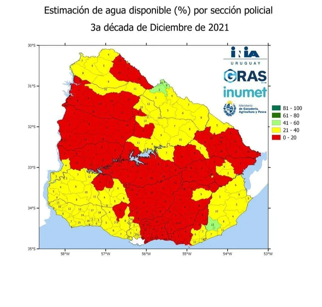 INIA Gras Estimación de agua disponible al final de diciembre de 2021. Según explicó, se prevé que entre enero y marzo la lluvia esté por debajo de lo normal, principalmente en el norte del país; mientras que se espera que las temperaturas de verano estén "por encima de lo normal en gran parte del país".
