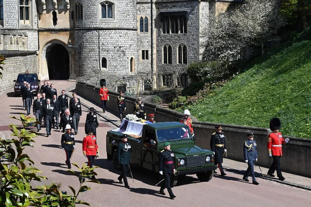 Los cuatro hijos y varios de los nietos de la pareja real acompañaron a pie hasta al Land Rover especialmente diseñado por Felipe durante un breve cortejo fúnebre por los jardines del castillo