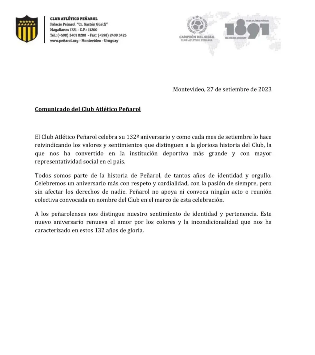 Peñarol emitió este miércoles un comunicado en el día previo a celebrar sus 132 años de vida institucional.