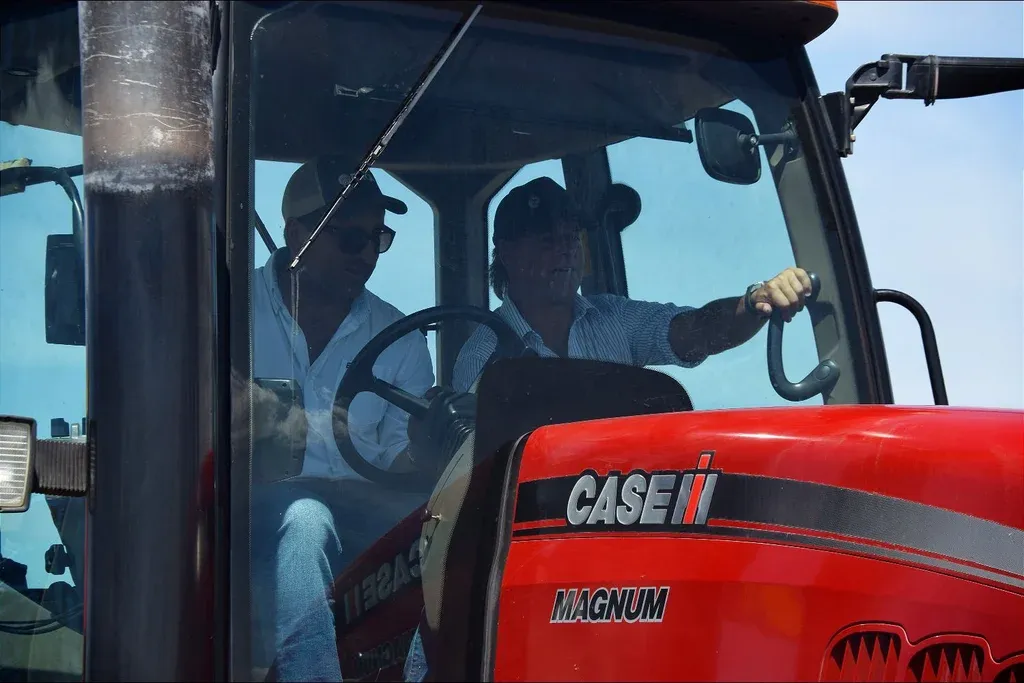 Juan Samuelle Diego y Lacalle Pou, en la cabina del CASE. Diego explicó que, junto al presidente, con un tractor Case y una sembradora Erca implantó soja en el campo.