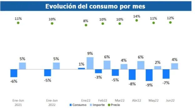 En junio se dio una caída del consumo del 7%, levemente por debajo del 9% que registró mayo y el 8% de abril.