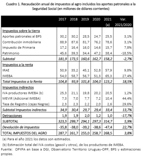 De acuerdo el trabajo de Opypa, la recaudación estimada de impuestos al sector agropecuario (descontadas las devoluciones de impuestos indirectos a las exportaciones) se estimó que se ubicaría en US$ 268,5 millones para 2021. Este nivel implicaría un aumento de US$ 9,8 millones, representando ello un incremento de un 3,8% con respecto al año anterior. Esta mayor recaudación se verificaría en todos los impuestos, a excepción del Impuesto al Patrimonio, que tuvo un importante incremento en 2020.