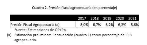 Para estimar la presión fiscal sobre el sector agropecuario (impuestos, incluyendo la contribución patronal a la seguridad social, sobre el PIB sectorial), se debió proyectar el PIB agropecuario del 2021, para lo cual se tomó en cuenta la variación de los precios al productor, las previsiones de crecimiento del producto y la variación del tipo de cambio, explicó la Opypa.