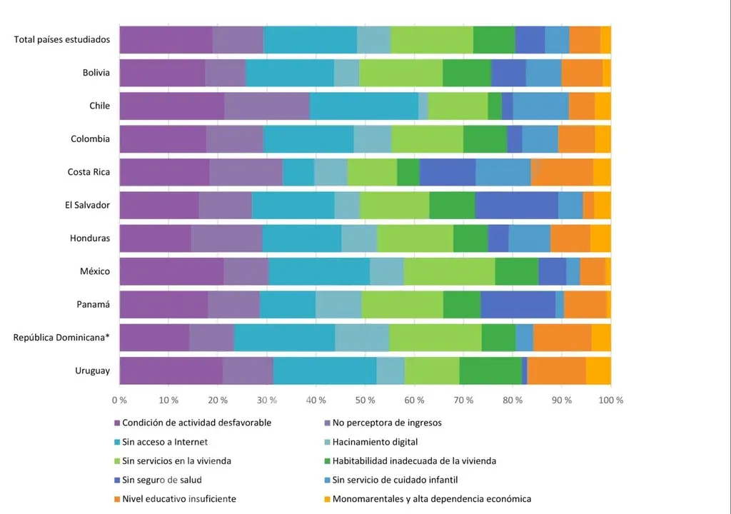 Más de un tercio de las mujeres adultas en Uruguay está privada de condiciones de empleo que le favorezcan y más de la cuarta parte carece de conexión a la red. Este último punto puede que sea polémico porque, por ejemplo, hay mujeres que no tienen acceso porque ni siquiera saben usar internet o una computadora (en especial adultos mayores) y no por la carencia per se.