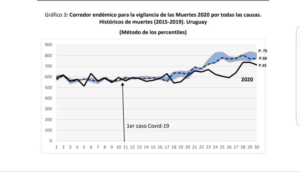 Se informa que “si bien el inicio de la pandemia en Uruguay se marca el día 13 de marzo, que corresponde a la semana epidemiológica 11, se observa en la semana epidemiológica 7, que corresponde al mes de febrero, un número mayor de muertes que las esperadas (…) Lo mismo se observa en las semanas epidemiológicas 10 (en el mes de marzo) y 17 (en el mes de abril). A partir de la semana 17 no se registra exceso de mortalidad general”.