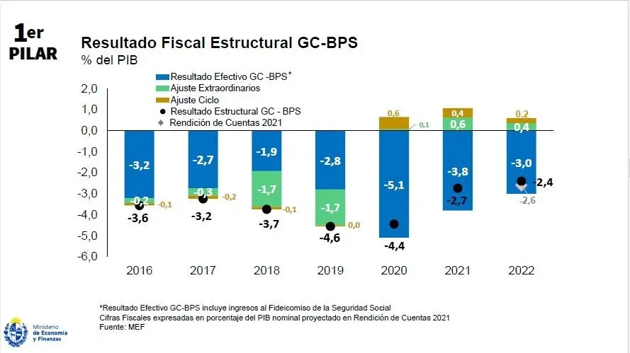 En tanto, el resultado fiscal proyectado en 2023 para GC-BPS es de 2,6% del PIB. Y el resultado fiscal estructural se proyecta en -2,5% del PIB.