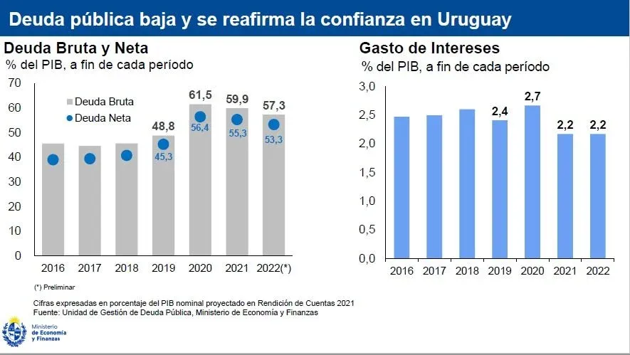 Con respecto a la evolución de la deuda pública en relación al PIB, se registró una leve caída en 2022. “Es importante resaltar que los intereses en términos del Producto siguen medio punto por debajo de 2020. Esto significa que tenemos más recursos para destinar a políticas públicas que sean decisión del Poder Ejecutivo”, afirmó.