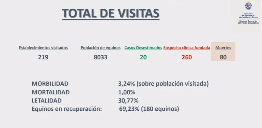Se visitaron 219 establecimientos en 16 departamentos, desde el 20 de noviembre al 8 de diciembre, desde los que hubo denuncias de casos de equinos con la sintomatología.