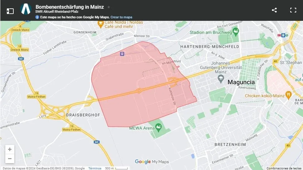 Una bomba estadounidense de la Segunda Guerra Mundial de 500 kilos fue encontrada este miércoles por la tarde durante obras de ampliación cerca del estadio MEWA Arena del Mainz 05.