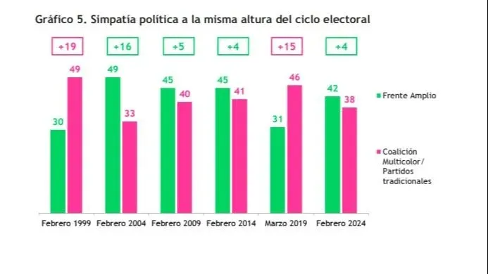 El análisis de la encuesta marca que "mirado en perspectiva más larga, durante todo el 2023 la diferencia del Frente Amplio sobre la Coalición Multicolor osciló entre cinco y siete puntos, y al comenzar el año electoral es algo menor (cuatro puntos). En cualquier caso, los datos muestran que la estructura de preferencias es competitiva entre dos bloques de peso similar (con leve ventaja al Frente Amplio). En un escenario como este, el proceso de definición de candidaturas y el avance de las campañas influirán decisivamente sobre el resultado final".