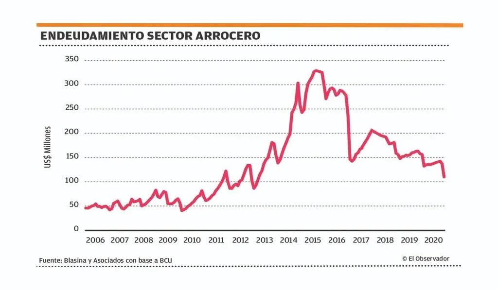 En el arroz baja el nivel de crédito junto a un descenso en la superficie, mientras se negocia darle aire financiero de mediano plazo. La deuda a junio fue de US$ 110 millones, una caída de 30% frente a igual período del año pasado y el más bajo desde setiembre de 2012, pero el porcentaje de créditos vencidos sobre el total fue de 11% contra el 7% de igual período del año anterior.